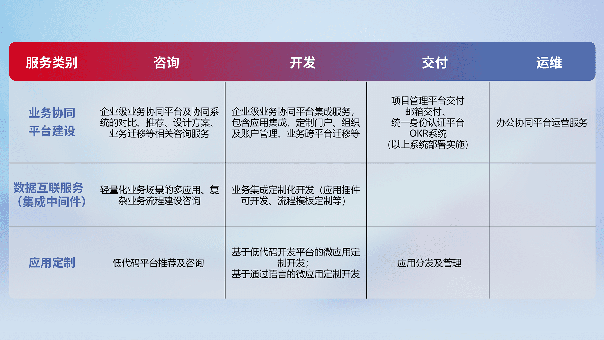 针对钉钉、、、、企微、、IDaas等平台级产品提供产品的规划、、、、方案、、交付、、、定制化开发等服务,,实现如统一协同办公、、、、智能客户服务、、混合会议管理、、智能数据查询、、、等业务场景,,实现数字化转型。。