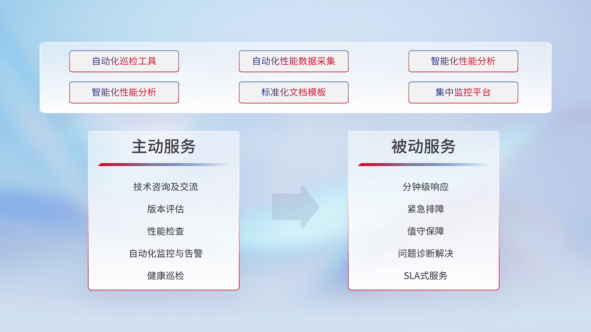 智能化工具和标准化文档,,,,保障服务质量,,,提供主动服务(包含技术咨询、、、版本评估、、、、性能检查、、、、自动化监控与告警、、、、健康巡检)和被动服务包含(分钟级响应、、、紧急排障、、、值守保障、、问题诊断解决、、SLA服务)。。。